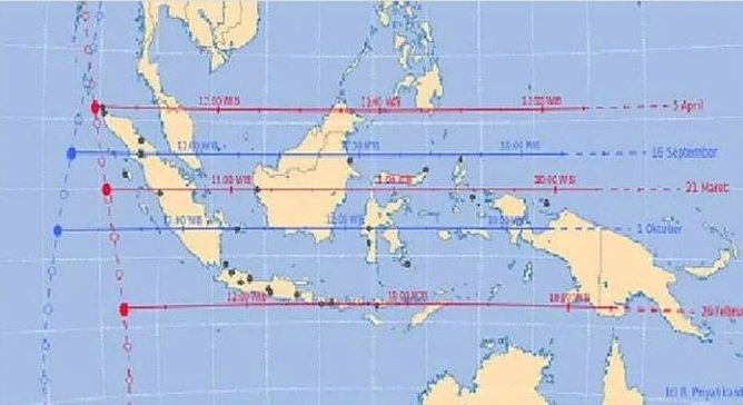 Andi juga menjelaskan, fenomena ini selalu terjadi dua kali dalam setahun untuk kota-kota atau wilayah yang terletak di antara dua garis. Garis Balik Utara (Tropic of Cancer; 23,4 derajat Lintang Utara) dan Garis Balik Selatan (Tropic of Capricorn; 23,4 derajat Lintang Selatan).