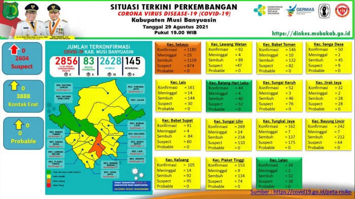 Kadin Kominfo Muba ini merinci, hingga 29 Agustus 2021 ada sebanyak 2856 kasus, diantaranya 2628 kasus sembuh. “Lalu, 83 masih dirawat, dan 145 kasus meninggal dunia,” urainya.
