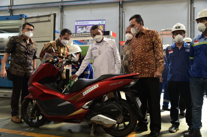 “Hari ini saya berkesempatan melihat langsung proses dari crude palm oil (CPO) ke bensin, ide ini sudah diinisiasi lama oleh Institut Teknologi Bandung (ITB) Prof. Soebagyo dan teman-teman, dan kemudian 2 tahun yang lalu kita dorong supaya bisa di scale up dari hasil skala laboratoriumnya. Dari skala pilot plantnya yang ada sekarang ini 1000 liter/hari itu sudah bisa dihasilkan juga bahan bakar bensa yang pada saat katalisnya masih segar itu bisa menghasilkan bahan bakar dengan The research octane number (RON) 115, bahan bakar yang berkualitas tingg,” tuturnya.