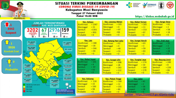 “Ada penambahan 27 kasus sembuh dan 2 terkonfirmasi positif per 27 Februari 2022,” ungkap Jubir Gugus Tugas Penanganan COVID-19 Muba, Seftiani Peratita SS MKes.