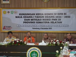 Palembang, BP- Komisi IV Dewan Perwakilan Rakyat Republik Indonesia (DPR RI) mengapresiasi penanganan penyakit mulut dan kuku (PMK) di Provinsi Sumatera Selatan. Pasalnya, kasus PMK sempat muncul beberapa waktu lalu di wilayah Sumatera Selatan (Sumsel).