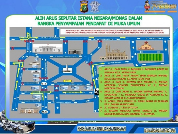 Jakarta, BP– Direktorat Lalu Lintas (Ditlantas) Polda Metro Jaya akan melakukan pengalihan arus lalu lintas di kawasan Istana Kepresidenan dan Monas dalam rangka pengaman aksi demo 411 pada Jumat (4/11) besok.