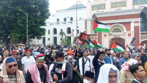 Palembang, BP- Ribuan umat Islam yang berasal dari berbagai daerah di Sumatera Selatan (Sumsel)menyatakan dukungan kepada Palestina dalam seruan aksi damai dan gema Takbir hingga membentangkan Bendera Palestina di Bundaran Air Mancur Masjid Agung Palembang, Senin (30/10).