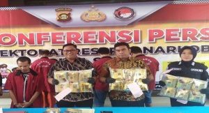 Palembang, BP- Ditresnarkoba Polda Sumsel mengamankan 38 kilogram sabu-sabu dan 9463 butir pil ekstasi yang disita dari empat orang tersangka di tiga lokasi berbeda.