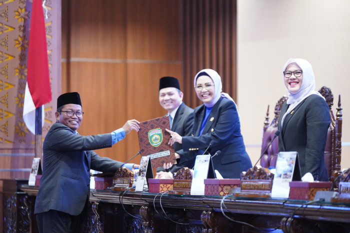 SETELAH melalui pembahasan yang cukup panjang akhir Penjabat (Pj) Gubernur Sumatera Selatan (Sumsel) Elen Setiadi,S.H,M.S.E, bersama Ketua DPRD Sumsel Hj Anita Noeringhati menandatangani keputusan bersama terkait dengan Raperda PT Bank Sumsel Babel (Perseroda) yang dilakukan di di Ruang Rapat Paripurna DPRD Sumsel, Jumat (13/9) siang.